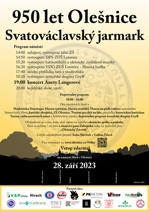 Pozvánka na tradiční Svatováclavský jarmark, který je spojen s oslavou 950 let od první písemné zmínky o Olešnici a koná se v Olešnici ve čtvrtek 28. září. Doprovodný program začíná v 10:00 dnem otevřených dveří v ZŠ Olešnice, v muzeu veteránu, muzeu strašidel, hasičské zbrojnici a dílně Modrotisku. Hlavní program na náměstí je připraven od 14:00 a v 19:00 vystoupí Aneta Langerová.